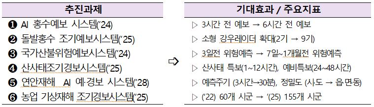 ㅇ AI 홍수예보 시스템 도입으로 예보 시간을 단축(3시간 전→6시간 전)하고, 선제적 산불 대비를 위해 기존 단기(3일전)만 제공하던 산불예측 정보를 중기(7일전), 장기(1개월전)까지 제공한다.