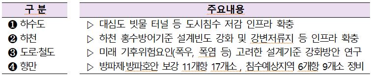 ㅇ 미래 기후변화 위험도를 고려한 기반시설 설계기준 강화 및 인프라 확충