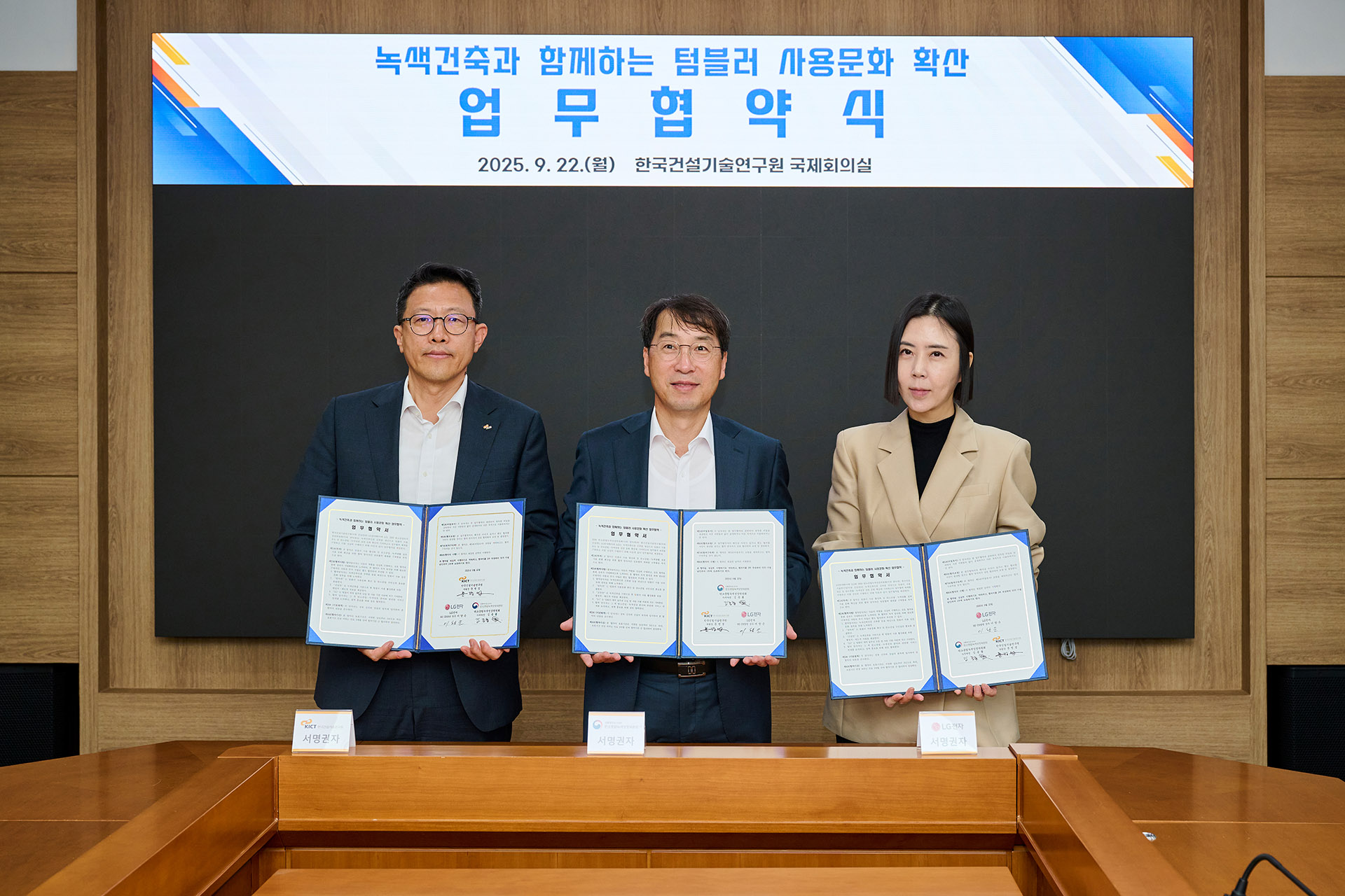 대통령직속 2050탄소중립녹색성장위원회(위원장: 김민석 국무총리, 이하 탄녹위)는 한국건설기술연구원(원장 박선규, 이하 건설연), LG전자(대표이사 조주완)와 함께 9월 22일 경기도 고양시 건설연 본관에서 “녹색건축과 함께하는 텀블러 사용문화 확산 업무협약”을 체결했다고 밝혔다.