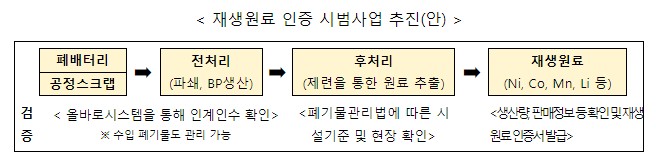 환경부는 이번 폐배터리 재생원료 인증 시범사업을 통해 재활용업계, 전문가 등으로 구성된 협의체를 운영하고 재생원료 인증방법 등을 구체화하여 인증제도 마련 및 관련 제도를 개선할 계획이다.