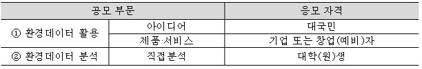 공모 분야는 공공 정보(데이터)를 활용한 아이디어와 제품·서비스를 개발하는 ‘활용’ 부문과 환경 현안 해결을 위해 데이터 분석을 수행하는 ‘분석’ 부문으로 나누어 진행된다. 환경에 대한 관심과 사회문제 해결에 대한 열정을 가진 사람이라면 누구나 참여할 수 있다.