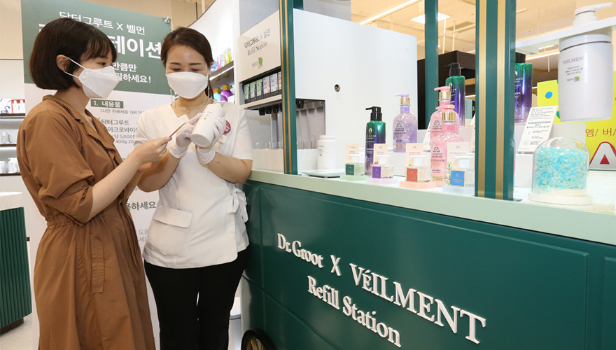 둘째, ‘리필스테이션 운영’이다. 지구를 후손에게 돌려주기 위한 캠페인 ‘빌려쓰는 지구 리필스테이션’을 운영하고 있다. 소비자들이 일상에서 플라스틱 사용을 줄이면서 환경보호에 직접 동참하는 것을 목적으로 시작되었다. 2021년 5월 이마트 죽전에 ‘빌려 쓰는 지구 리필스테이션’ 1호점을 개점한 이후 7월에는 서울 가로수길에 2호점 ‘엘 헤리티지 1947’을 열었다. 리필스테이션에서는 샴푸와 바디워시의 내용물을 리필 용기에 소분해 판매하며 제품의 내용물을 원하는 만큼 덜어서 살 수 있는 게 특징이다.