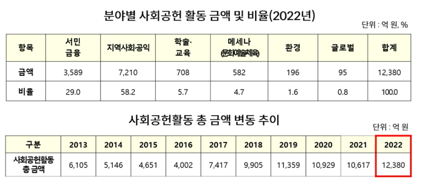 사회공헌을 하는 많지만 100대 기업을 기준으로 사회공헌 현황을 살펴보고자 한다. 2023 사회공헌백서에 따르면 100대 기업의 사회공헌은 1조 9,100억 원으로 2021년 1조 5,684억보다 22% 이상 증가했다. 사회복지(39%), 환경보호(12%), 교육(12%)로 수준으로 환경에 대한 사회공헌활동은 상위권 수준이었다. 은행권의 사회공헌을 살펴보면 22년 은행권 사회공헌활동 금액은 1조2천억 원 넘은 것으로 나타났다. 항목별로 살펴보면 지역사회·공익 58.2%, 서민금융 29%, 환경 1.6%로 대기업과 달리 환경에 대한 활동의 관심은 다소 저조한 것으로 나타났다.