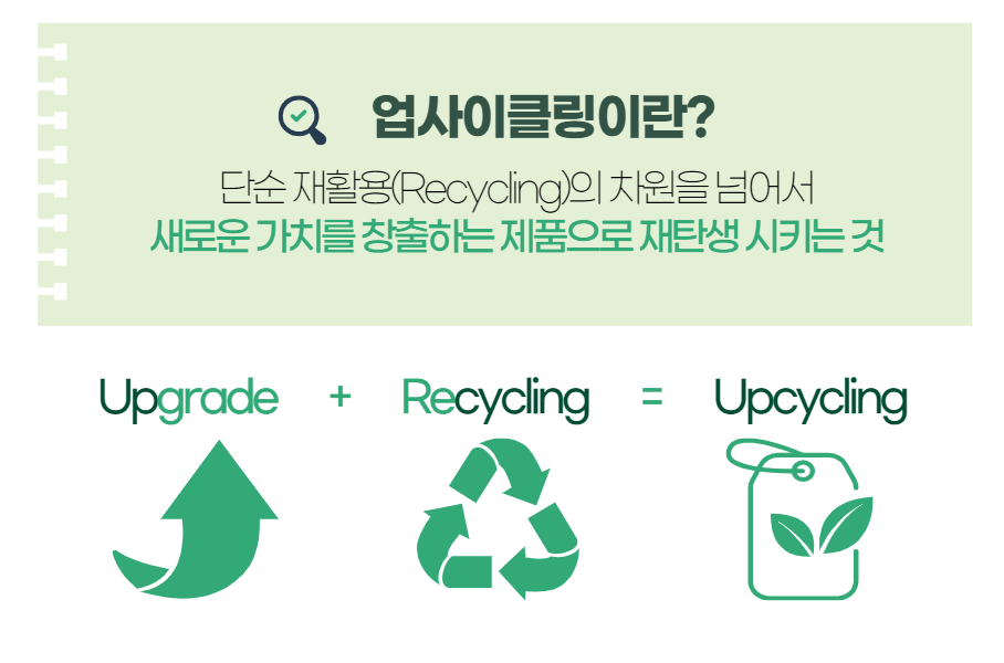 ‘업사이클링’에 관해 들어본 적이 있으십니까? 영단어 'Upgrade'와 ‘Recycling’이 합쳐져 탄생한 단어인 '업사이클링(Upcycling)'은 버려진 폐기물을 단순 재활용하는 '리사이클링(Recycling)'에서 한 단계 더 진화한 개념입니다. 쓸모를 다한 제품에 디자인, 기술 등을 접목해 새로운 가치를 불어넣는 가치상향형 재활용을 의미하는 것입니다. 여러분들이 잘 알고 있다시피 리사이클링, 즉 재활용은 폐기된 자재를 새롭게 다시 사용하여 원자재의 소비를 줄이고, 쓰레기의 양을 줄이는 방법의 하나입니다.