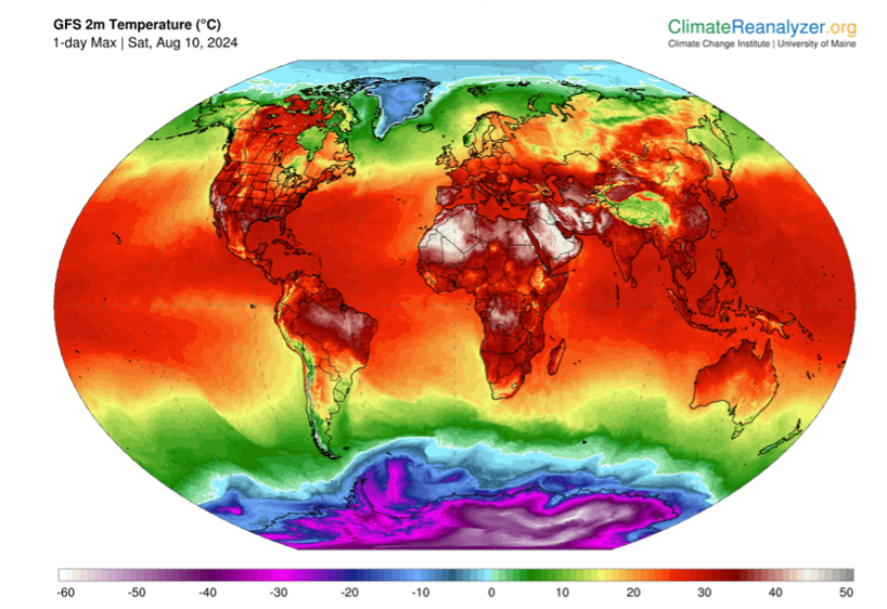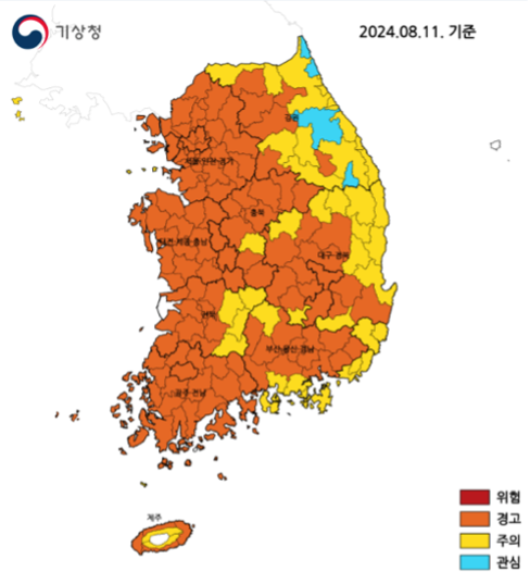 (2024년 8월 10일, 11일 기준)전세계 최고기온 그리고 한국의 폭염 위험 수준 분포도 (사진=ClimateReanalyzer.org, 기상청)