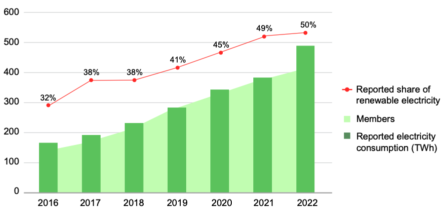 현재 RE100을 선언하고 참여하는 국가는 2022년 기준 63개국이며 기업은 420여 곳이다. 대표적인 기업으로는 Apple, Google, TSMC, 나이키 등이 있으며 한국 기업은 삼성전자, SK하이닉스, LG에너지솔루션 등이 있다.