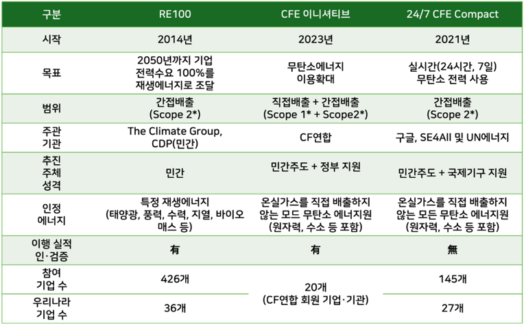 주요 국제 이니셔티브 비교 (자료=산업통상자원부 보도자료(2024.1.29), 탄소중립을 위해 모든 무탄소 에너지 최대한 활용, 인용 저자 재구성)