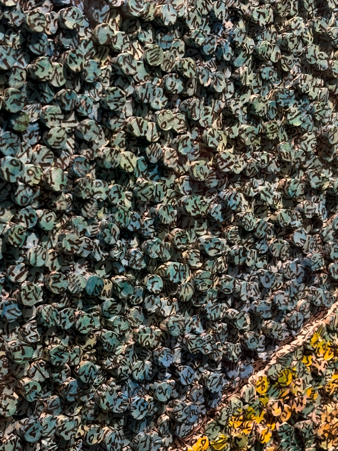 내촌목공소와 남희조 작가의 작품들을 둘러보고 나면 마지막 섹션에서 허회태 작가의 작품을 마주치게 됩니다. 40년 넘게 서예를 수련한 허 작가의 여러 붓글씨 작품부터 한지를 활용해 제작한 작품들까지 전시되어 있습니다. 아래 작품은 한지를 사용해 수많은 스티로폼 조각을 하나씩 감싸 서로에게 기댈 수 있는 군집을 형성하여 부착한 수공예 창작물입니다. 인간이 배출하는 플라스틱 쓰레기 중 가장 많은 양이 스티로폼이라는 기사를 접하고 환경 정화에 일조하고자 작업의 주 소재로 삼기 시작했다고 합니다.