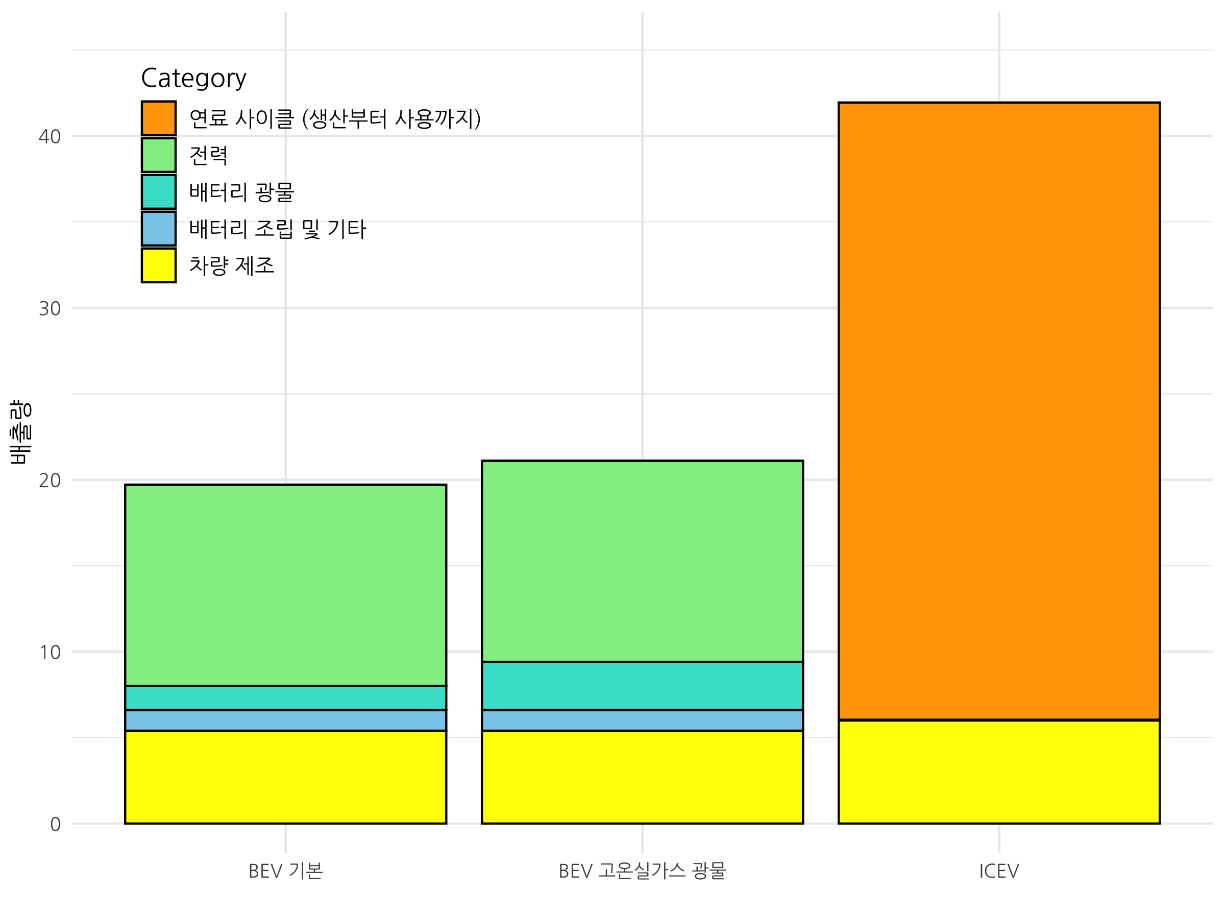 이렇게 특정 물품의 탄소배출의 요람에서 무덤까지 보여주는 LCA 방법론은 앞선 언급된 그린워싱 사례들처럼 어떤 단계를 보여주냐에 따라서 결과가 다를 수도 있습니다. 전기차 (이하 BEV, Battery Electric Vehicle)과 내연기관차(이하 ICEV, Internal Combustion Engine Vehicle) 간의 비교도 어떤 측면을 강조하느냐에 따라서 때론 내연기관차가 더욱 친환경적이라는 결과가 도출됩니다.