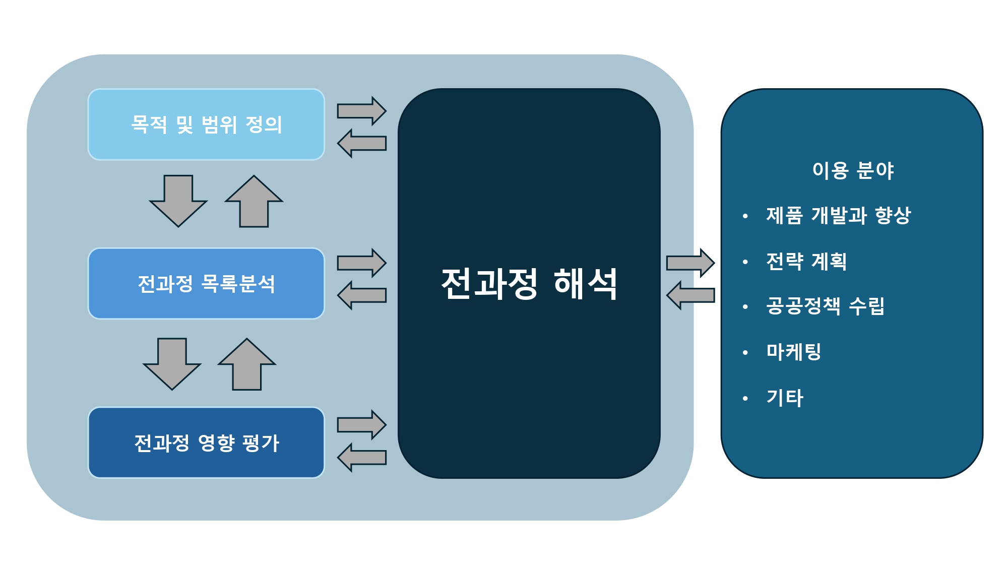 LCA 방법론은 목적 및 범위 정의, 전과정 목록 분석, 전과정 영향 평가와 전과정 해석 등 총 4단계의 실행과정을 통해 시행됩니다. 목적에 따라 방법론과 결과가 달라질 수 있으니 목적 및 범위 정의에서 LCA를 시행하는 목적을 구체화하고 앞서 선정한 목적에 필요한 정보 수집을 통해 전과정 목록을 작성합니다. 영향 평가 단계는 앞서 작성된 목록을 기준으로 투입·산출물의 잠재적인 영향성을 기술적, 정성적, 정략적으로 파악하는 것이며 분류, 특성화, 정규화 및 가중 부여 등 네 가지로 구성됩니다. 마지막으로 영향 평가단계까지의 결과를 가지고 첫 단계에서 설정한 평가 목적에 맞게 개선안 및 활용방안을 도출하는 것이 전과정 해석 단계입니다.