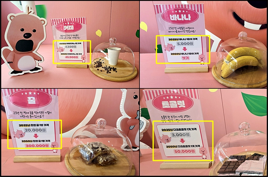 게다가 ‘25년 전 떡에 꿀을 찍어 먹던 시절을 기억하는 분이 있나요?’라고도 적혀 있어 충격적이었습니다. 2050년에는 떡에 꿀 찍어 먹기도 힘든가 하는 생각이 들었거든요. 안내판을 보니 더 슬퍼졌는데요. 2025년 현재 천연 꿀 한 병에 20,000원이라면 2050년에는 무려 300,000원이라고 적혀 있었습니다. 꿀 먹기 힘든 날이 온다니 믿어지지 않아요. 또 초콜릿도 현재 3,000원에서 2050년 50,000원이 된다니 초콜릿을 좋아하는 저는 참 마음 아픈 이야기입니다. 이런 미래가 오지 않도록 탄소중립 실천에 적극 동참해야겠죠!