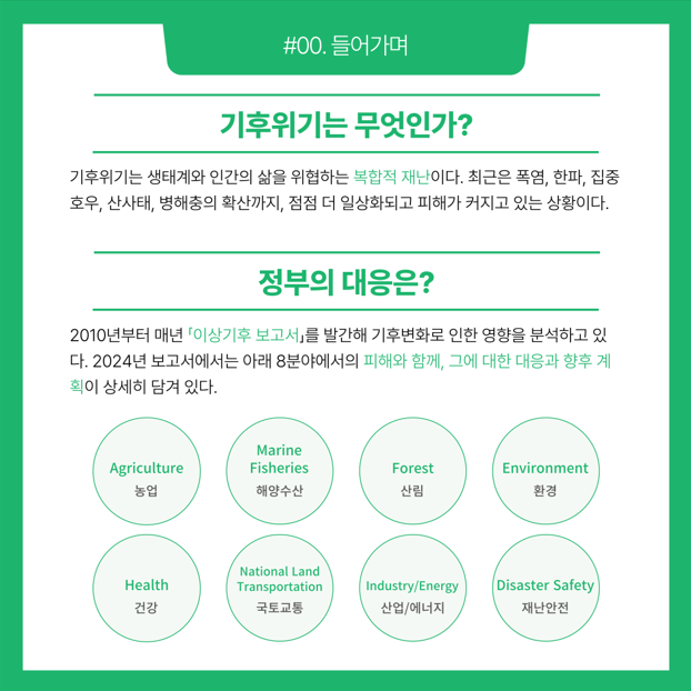 우리 정부는 2010년부터 매년 이상기후 보고서를 발간해 기후변화로 인한 영향을 분석하고 있다. 2024년 보고서에는 8개 분야에서의 피해 현황과 이에 대한 대응 및 향후 계획이 상세히 담겨 있다. 본 기사에서는 그중 산림 분야의 피해 상황과 대응 방안을 톺아보며, 우리가 준비해야 할 점을 짚어보고자 한다.