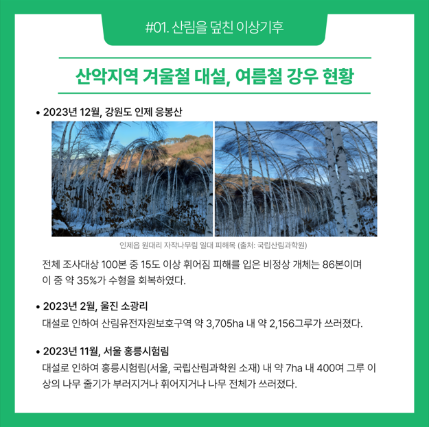 먼저, 겨울철 강설과 여름철 강우가 산림에 미친 영향을 살펴보자. 202312, 강원도 인제 응봉산 기온이 최대 영하 20°C까지 떨어지고, 사흘간 56mm가 넘는 강수량이 관측되었다. 이 폭설로 인해 자작나무는 휘어지고, 부러지고, 넘어졌다. 이후에도 계속된 강설로, 울진 소광리에서는 금강송 약 2,156그루가 쓰러졌고, 서울 홍릉시험림에서도 400그루 이상이 피해를 입었다.