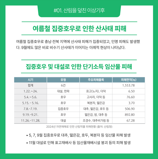이듬해 여름에도 산림은 쉽지 않은 시간을 보냈다. 78일부터 24일까지 이어진 집중호우는 충남과 전북 일대에 큰 피해를 안겼다. 이 기간 동안 발생한 피해 면적은 전국 산사태 피해의 95%에 해당하는 169.89ha에 달했고, 인명 피해도 보고되었다. 특히 9월에는 예년보다 많은 비가 내려 산사태가 비수기에도 발생하는 이례적인 현상까지 이어졌다.