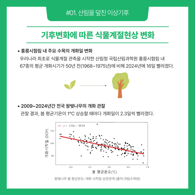 이러한 기후변화는 계절의 흐름마저 바꾸고 있다. 국립산림과학원 조사에 따르면, 홍릉시험림 내 주요 수목의 개화일은 50년 전보다 평균 16일 빨라졌고, 낙엽 시기는 늦어졌다. 또한, 2009~2024년간 전국 왕벚나무의 개화를 관찰한 결과, 봄 평균 기온이 1도 상승할 때. 개화가 2~3일 빨라지기도 했다. 이 밖에도, 재선충병의 피해가 증가하고 있으며, 멸종위기 고산지역 침엽수종의 쇠퇴 현상도 계속되고 있다. , 산림 생태계의 건강이 점차 위협받고 있는 것이다.