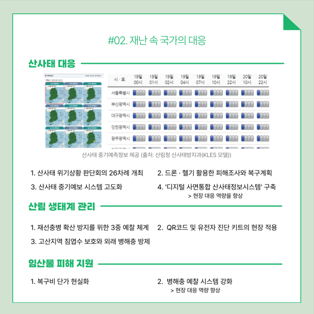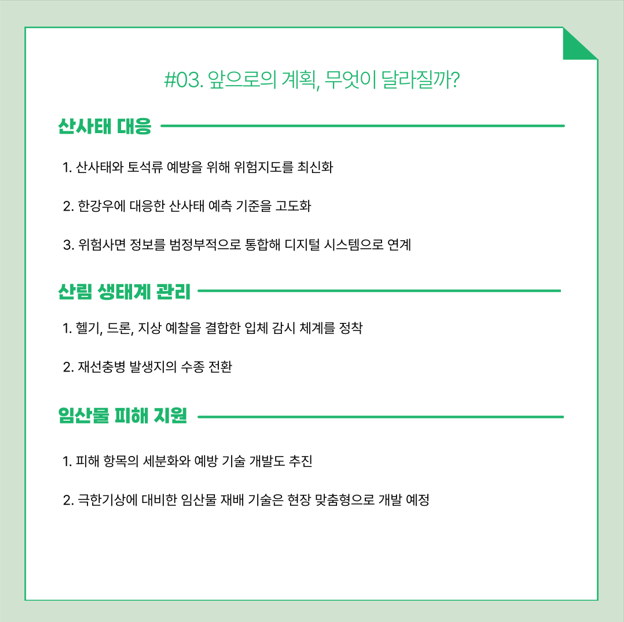 이런 현실 속에서 정부도 대응에 박차를 가하고 있다. 산림청은 산사태 위기상황 판단 회의를 26차례 개최하고, 드론과 헬기를 활용하여 피해조사와 복구 계획 수립에 힘쓰고 있다. 또한, 산사태 중기예보 시스템을 고도화하고, ‘디지털 사면통합 산사태정보시스템을 구축해 현장 대응 역량을 높이고 있다.