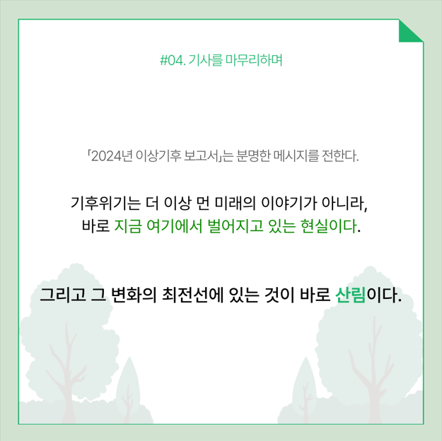 2024년 이상기후 보고서는 분명한 메시지를 전한다. 기후 위기는 더 이상 먼 미래의 이야기가 아니라, 바로 지금 여기에서 벌어지고 있는 현실이다. 그리고 그 변화의 최전선에 있는 것이 바로 산림이다.