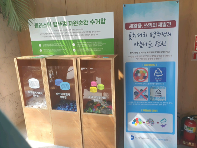 손님에게 대접하기에는 위생적으로 플라스틱 물, 음료가 좋지만, 플라스틱 쓰레기가 많이 생기기에 쓰레기는 분리수거하고, 병뚜껑은 따로 모아서 자원순환에 활용하고자 한 사례입니다.