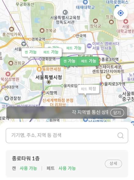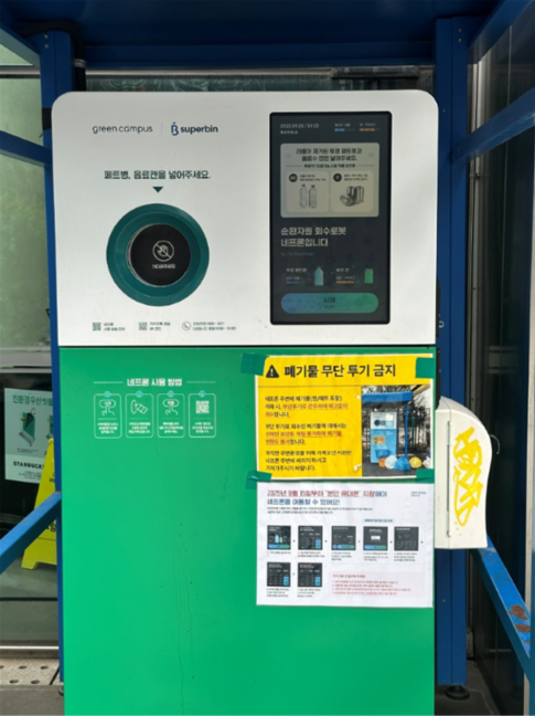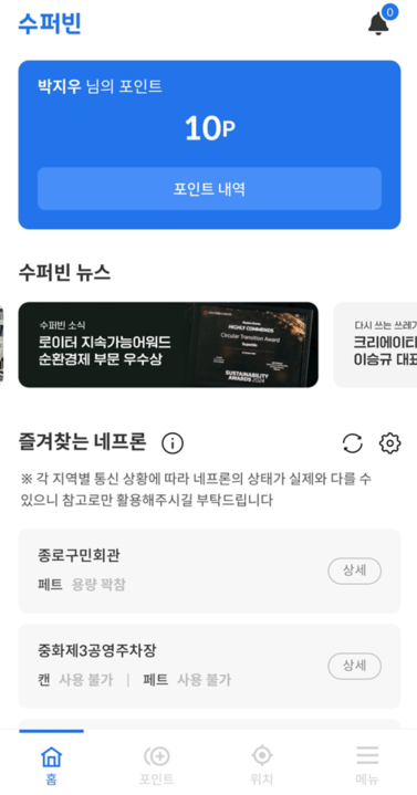 필자는 네프론을 체험하기 위해 먼저 수퍼빈 전용 어플리케이션을 내려받았다. 앱에서는 주변에 설치된 기계 위치를 확인할 수 있었고, 무엇보다도 현재 기계의 상태를 미리 볼 수 있었다. 예를 들어 “현재 페트병 투입 가능 여부”, “운영 시간”, “1인 1일당 투입 개수 제한” 같은 정보가 표시되어 있어 불필요한 이동을 줄일 수 있었다. 또한 수퍼빈 공식 홈페이지에서도 네프론 설치 장소를 검색할 수 있어, 앱을 사용하지 않는 시민들도 손쉽게 위치를 확인할 수 있다.