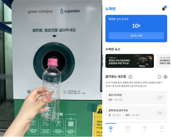 곧이어 앱 화면에는 포인트가 적립되었다. 단순한 안내 기능이 아니라 실제로 보상 체계가 작동하는 것이다. 수퍼빈 포인트는 현금으로 전환할 수 있어, ‘쓰레기도 돈이다, 재활용도 놀이다’라는 슬로건이 현실로 다가왔다. 버려지던 자원이 곧바로 가치로 환산되는 과정을 직접 경험하면서, 환경 보호라는 의무감뿐 아니라 합리적인 보상이 지속적인 참여 동기로 이어짐을 체감할 수 있었다.