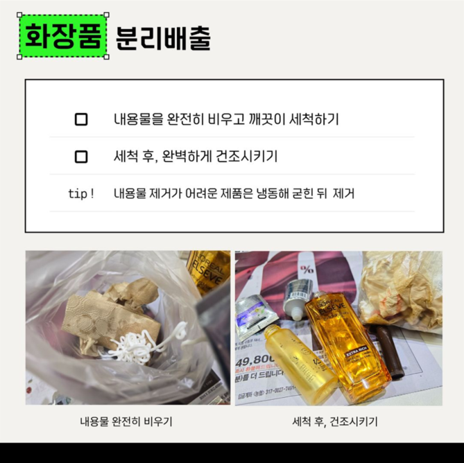 화장품은 제품마다 재질이 다르고 크기가 작아 버릴 때 번거롭지만, 정확한 분리배출이 필요하다. 종류별 올바른 폐기 방법을 알아보기 위해 로션·마스카라·립밤 등 다양한 용기를 모아 직접 분리배출 과정을 진행했다.