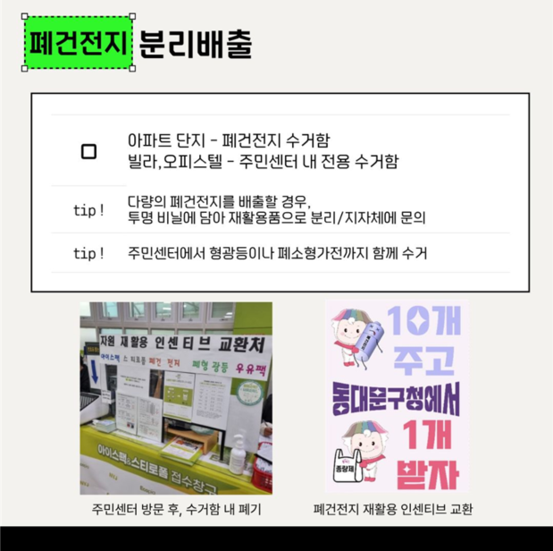 가정 내에 쌓인 폐건전지는 버리는 방법을 몰라 방치되기 쉽고, 일반쓰레기에 함께 버려지는 경우도 적지 않다. 아파트 단지에는 폐건전지 수거함이 마련돼 있었지만, 빌라나 오피스텔은 그렇지 않아 주민센터 내 전용 수거함을 이용해야 했다.