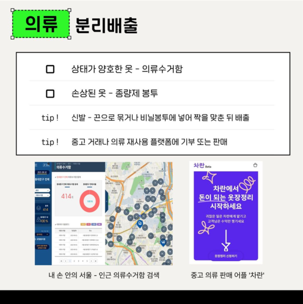 의류는 일상에서 가장 많이 배출되는 생활폐기물 가운데 하나다. 그만큼 올바른 배출 방법을 알고 실천하는 것이 중요하다. 세탁 후 상태가 양호한 옷은 재사용이 가능해 의류수거함에 넣고, 오염이 심하거나 손상된 옷은 종량제 봉투에 담아 폐섬유류로 배출하였다. 특히 신발은 끈으로 묶거나 비닐봉투에 넣어 짝을 맞춘 뒤 배출하는 것이 원칙이다.