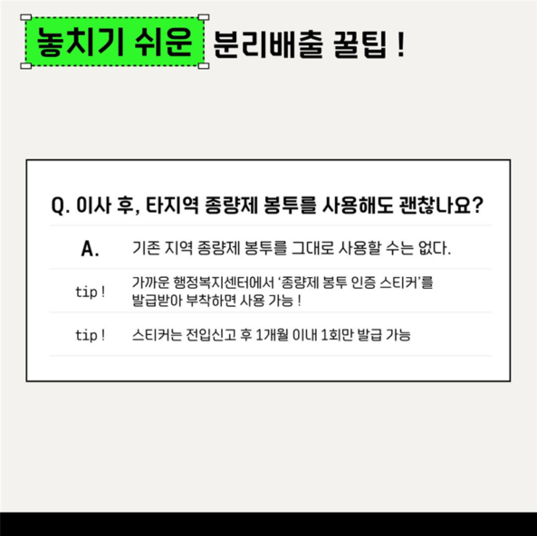 이 밖에도 생활 속에서 놓치기 쉬운 분리배출 정보가 있다. 지역별로 종량제 봉투 규격이 달라, 이사 후 기존 지역 봉투를 그대로 써도 되는지 헷갈리는 경우가 많다. 이 경우에는 가까운 행정복지센터를 방문해 전입 사실을 확인한 뒤, ‘종량제 봉투 인증 스티커를 발급받아 부착하면 된다. 이렇게 하면 타 지역 봉투도 사용할 수 있다.