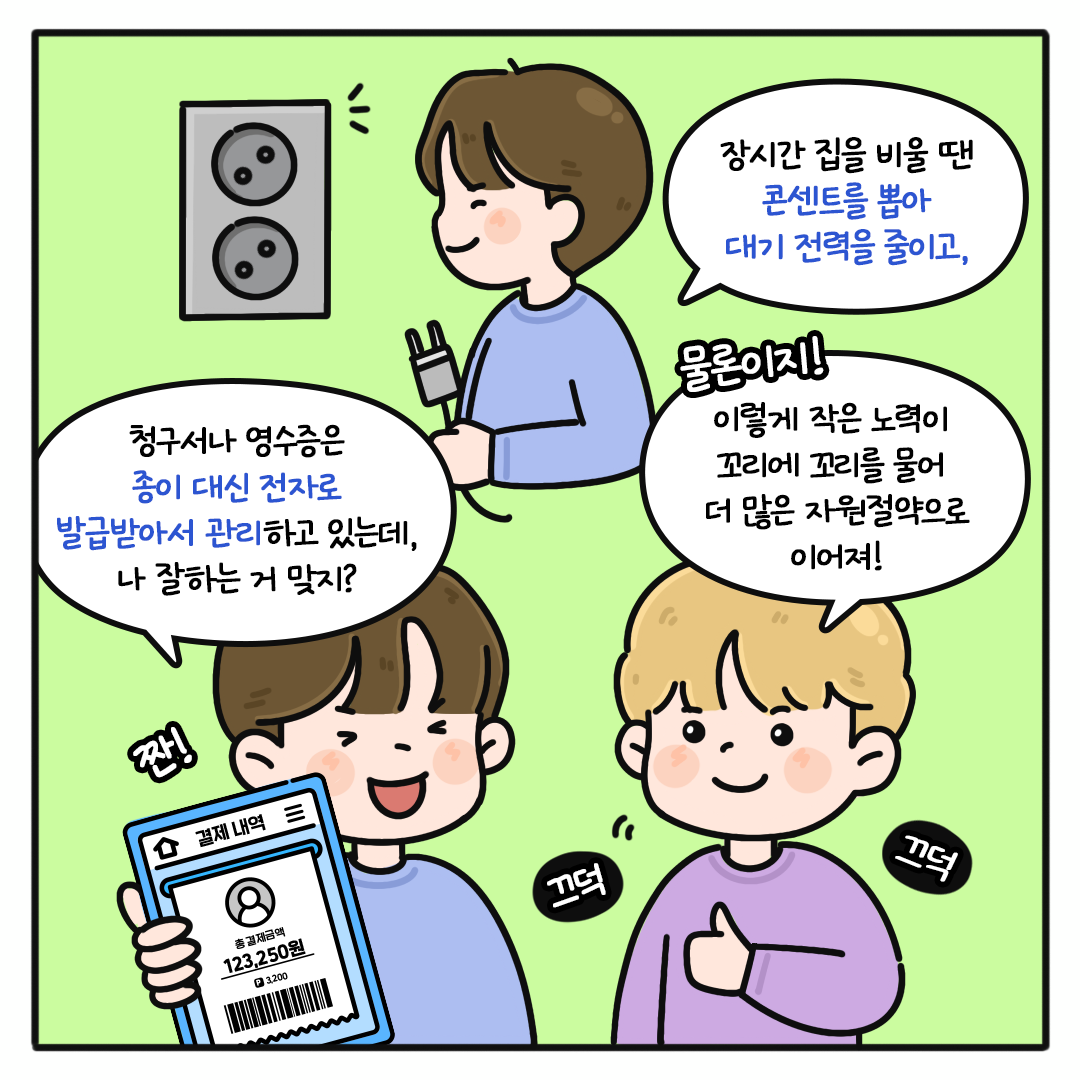 이렇게 작은 노력들이 꼬리에 꼬리를 물며, 더 많은 자원절약으로 이어질 수 있을 거예요!
