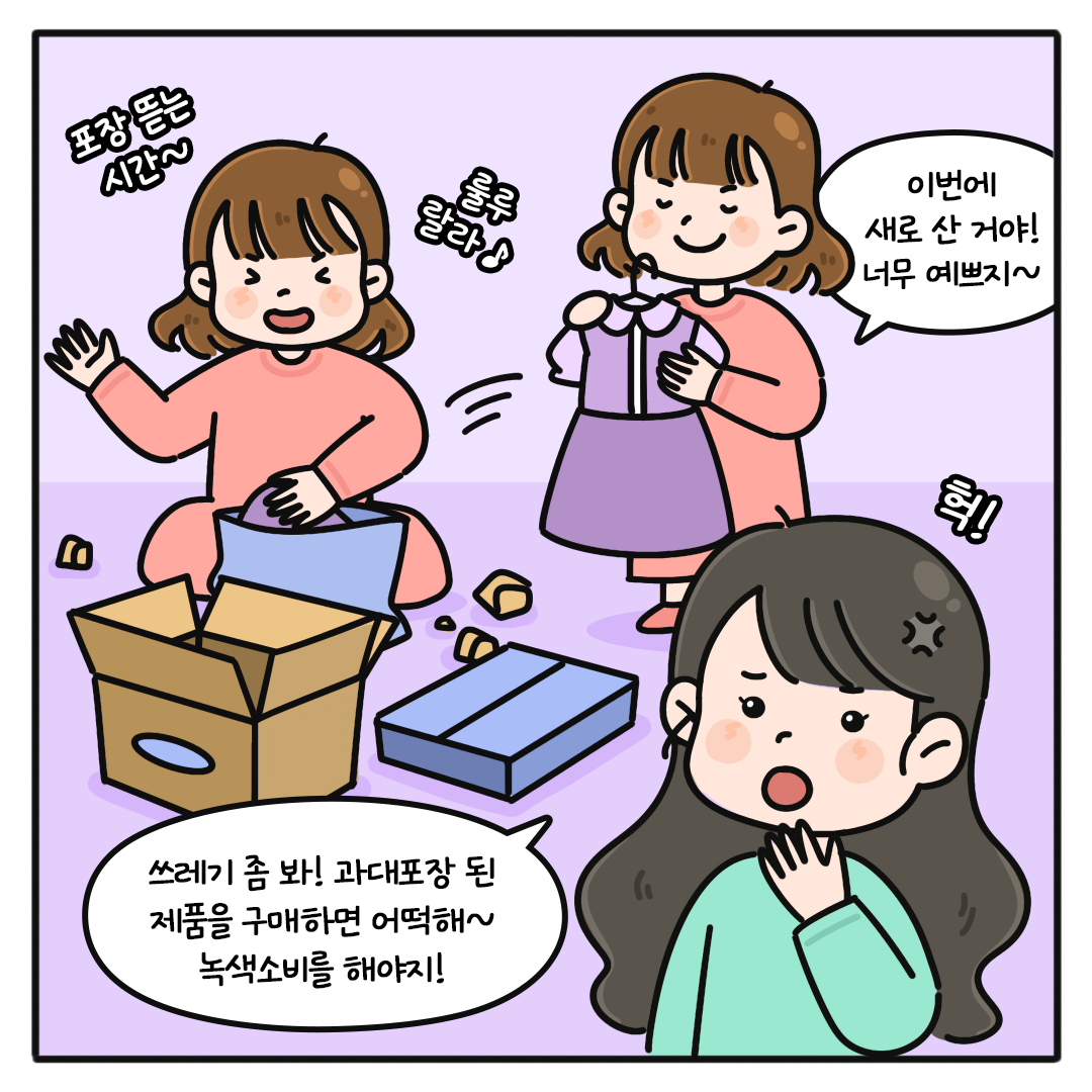 “헉 쓰레기 좀 봐! 과대포장된 제품을 구매하면 어떡해~ 녹색소비를 해야지!”