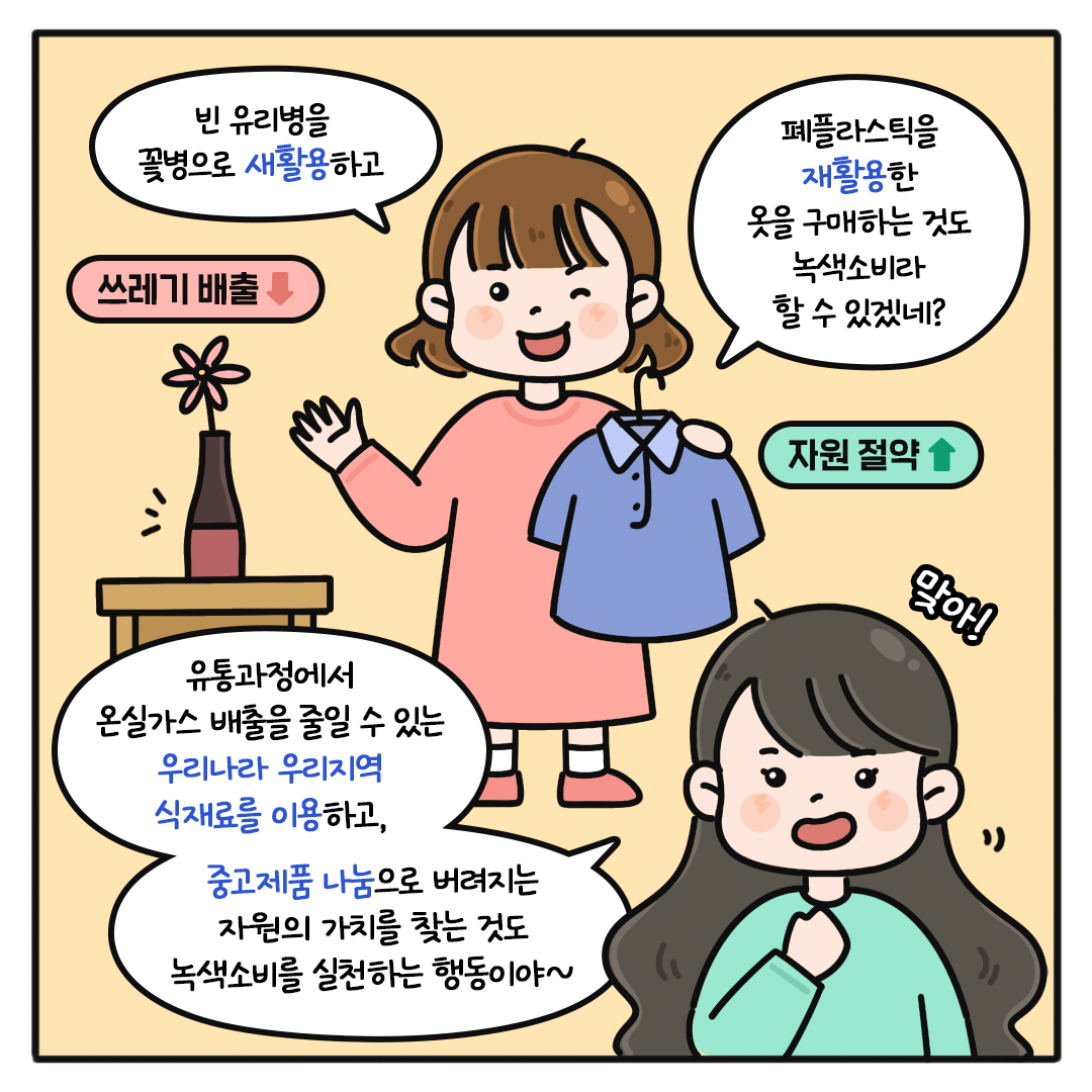 녹색소비란 소비를 하는 과정에서 발생하는 오염을 줄이고 자원을 효율적으로 사용하는 소비를 말해요!
